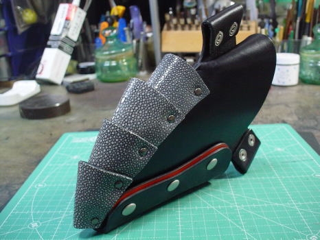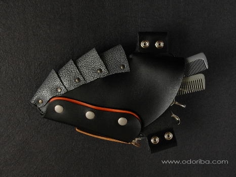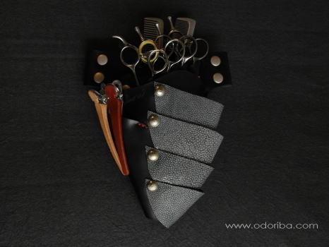 B-01 (Vataru) color 黒 Material エイ革・牛革 Size H225×W150 Scissor 4丁入れ 付属品 ベルト付き ベルト詳細へ 【コメント】 エイ革を止めている4つのコンチョは、シルバーを使用しています。 スライドカットの生みの親 原宿のOzakaさんと共同開発したシザーケースです。 68,000円(税込) お買い物ページへ