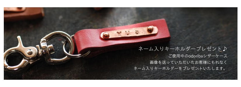 ご使用中のodoribaシザーケース画像を送っていただいたお客様にもれなくネーム入りキーホルダーをプレゼントいたします。